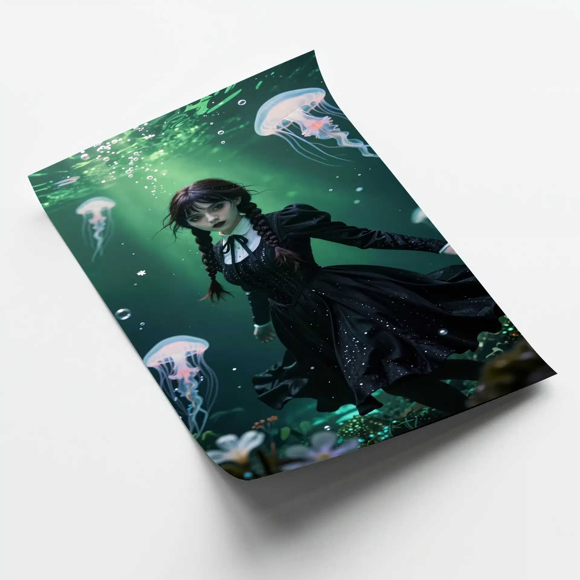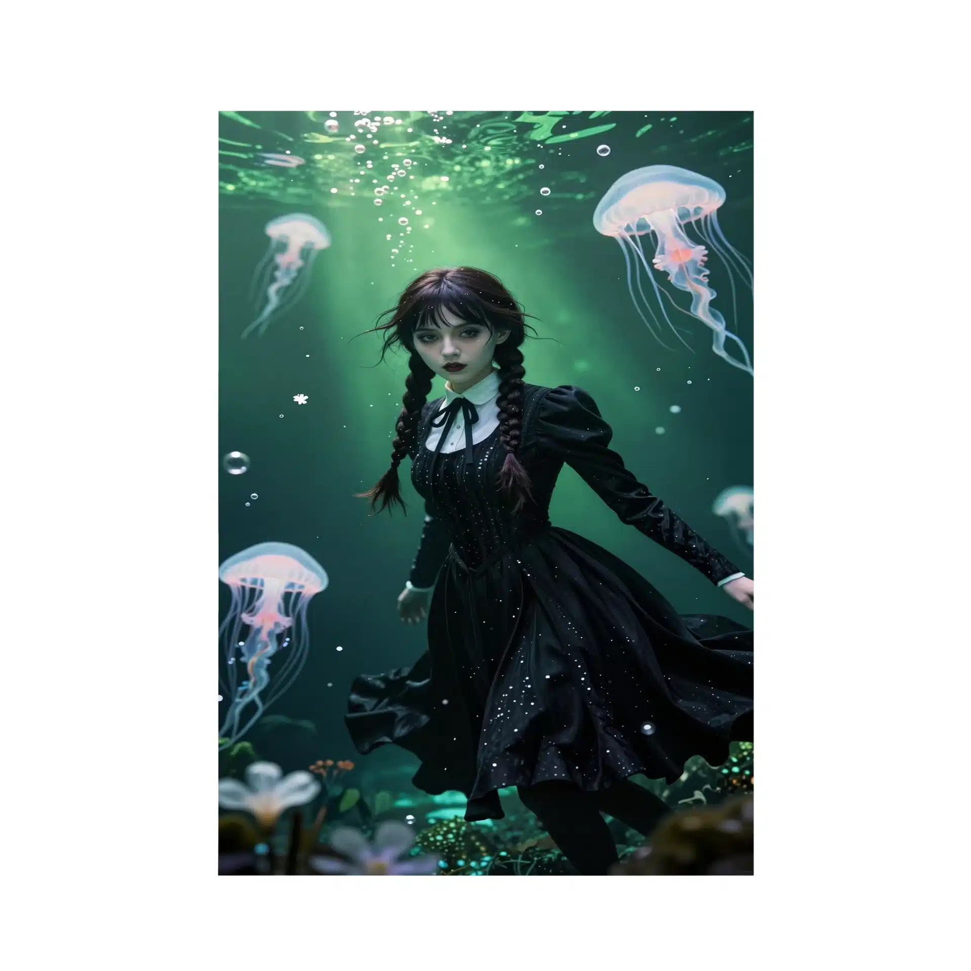 پوستر ‘ونزدی’ با الهام از شخصیت وونزدی آدامز، صحنهای خیالانگیز و زیرآبی را به تصویر میکشد. این اثر با سبک انیمه و نورپردازی سینمایی، ترکیبی منحصر به فرد از زیبایی گوتیک و شگفتیهای زیر آب را ارائه میدهد.