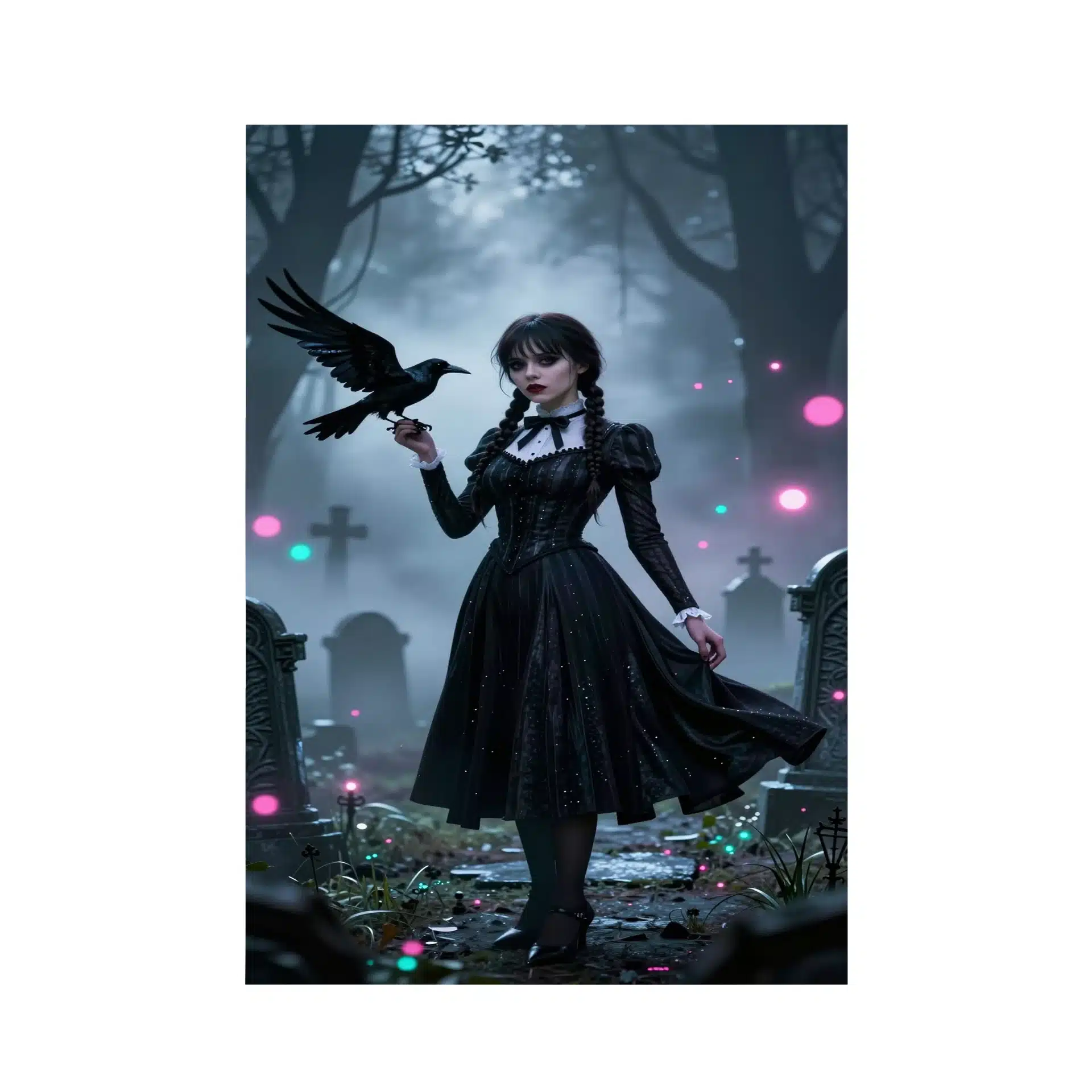 این تصویر با جزئیات فوقالعاده و کیفیت 8K طراحی شده است، که در آن لباس سیاه ونسدی در باد موج میزند و سنگقبرهای گوتیک با نورهای بوکه درخشان احاطه شدهاند. فشردهسازی تلهفوتو عمق سینمایی بینظیری به تصویر بخشیده است.