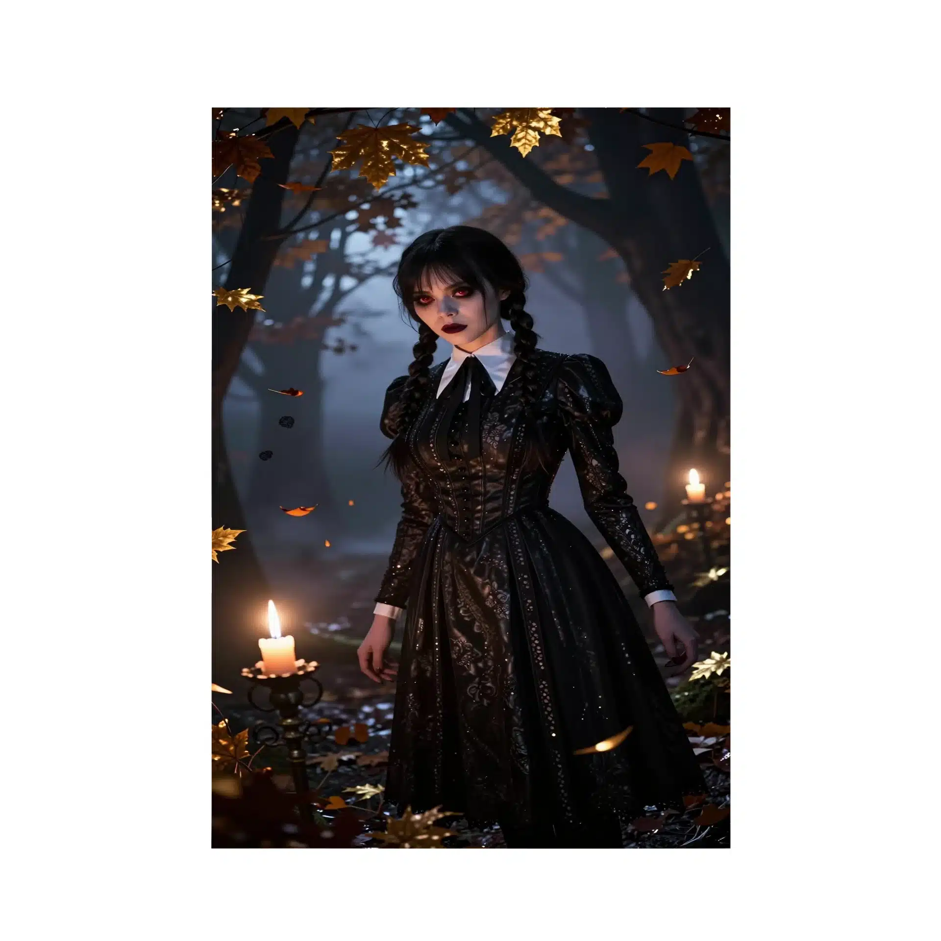 پوستر محصول ‘ونزدی’ با الهام از شخصیت جذاب و مرموز وندزدی آدامز طراحی شده است. این اثر در یک جنگل افسانهای و مهآلود در زمان غروب خورشید به تصویر کشیده شده، جایی که نور شمعهای در حال لرزش، سایههای دراماتیکی بر چهره رنگپریده او میاندازد.
