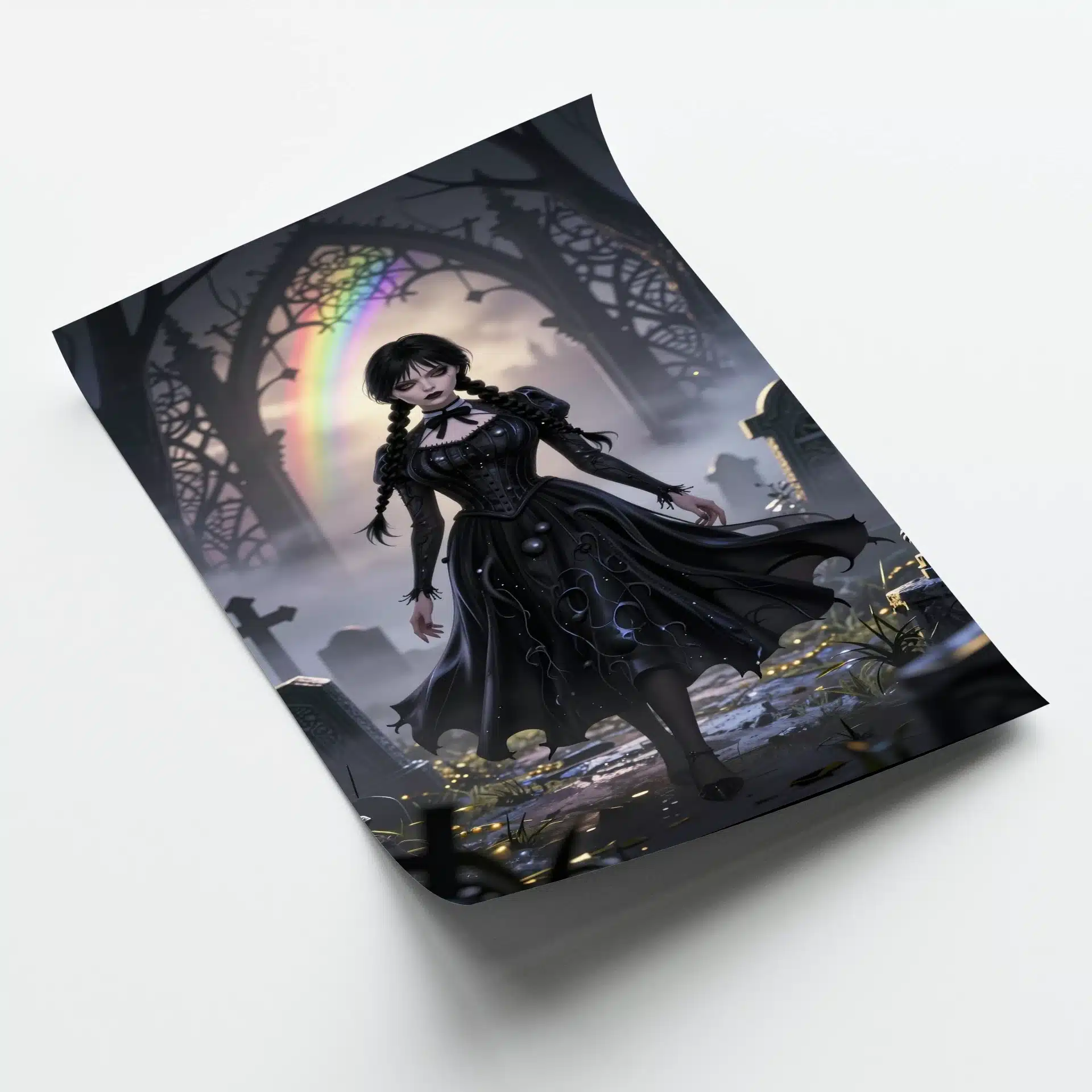 طراحی این پوستر با جزئیات بالا و الگوهای گوتیک در پسزمینه، همراه با رنگآمیزی تاریک آبی و طلایی و سایههای پاستلی رنگینکمانی، لباس سیاه سیال ونسدی را در مه به تصویر میکشد. حالت بیاحساس و معروف چهرهاش، این اثر را به یک والپیپر پرطرفدار تبدیل میکند.