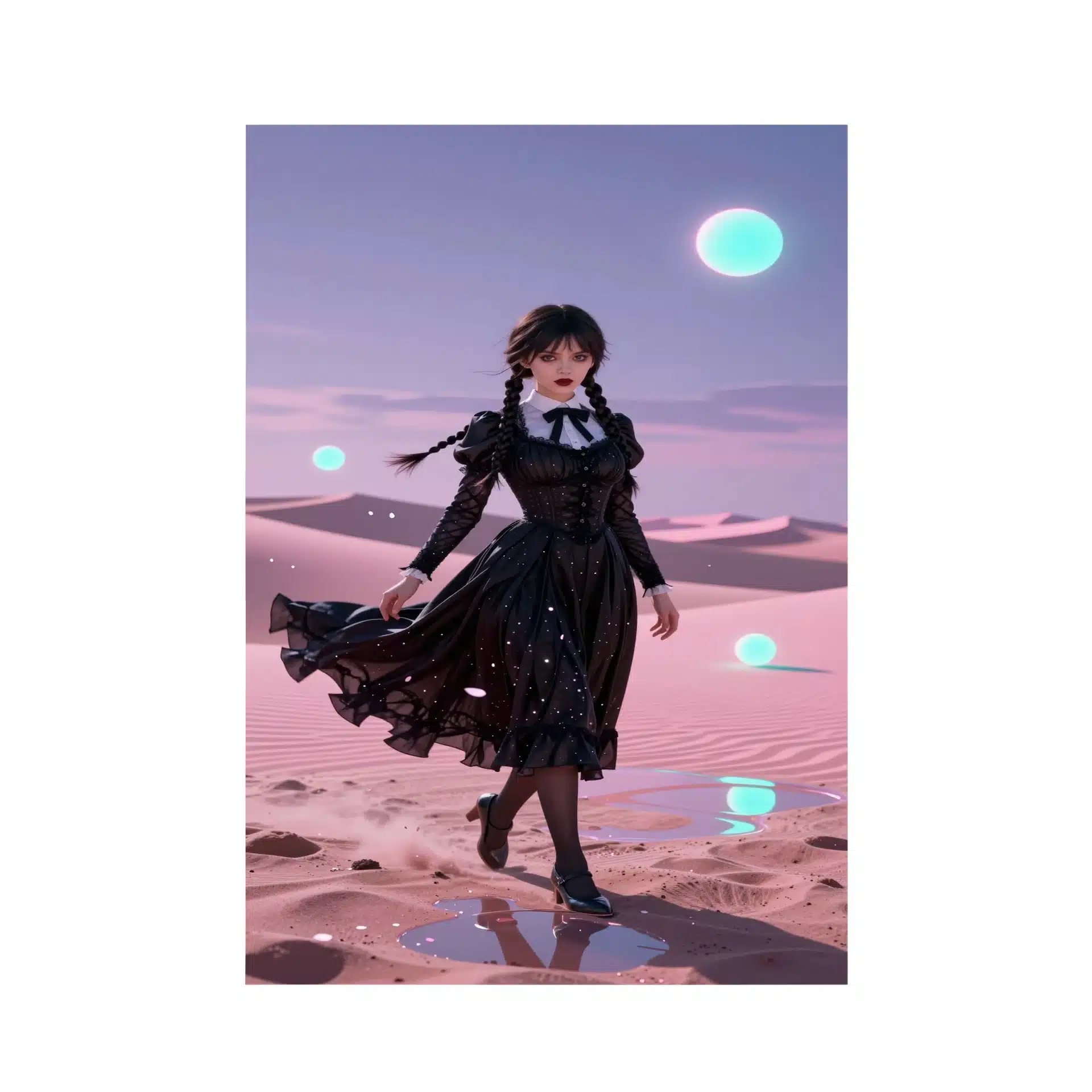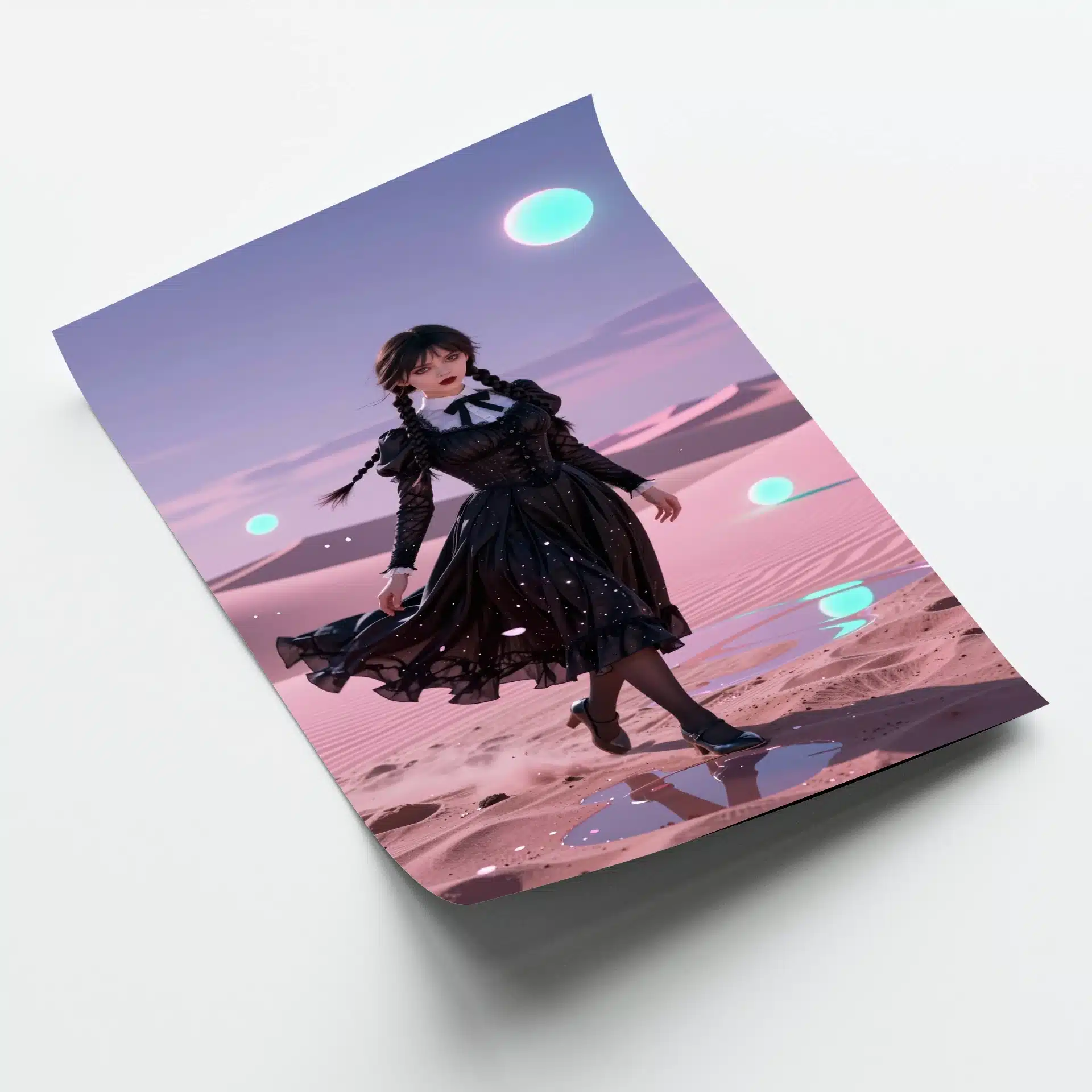 پوستر محصول ‘ونزدی’ با الهام از شخصیت جذاب و گوتیک ‘ونزدی آدامز’ طراحی شده است. این اثر هنری با سبک انیمه و فضایی سورئال، ترکیبی منحصر به فرد از زیبایی تاریک و زیبایی شناسی وِیپروِیو را ارائه میدهد.