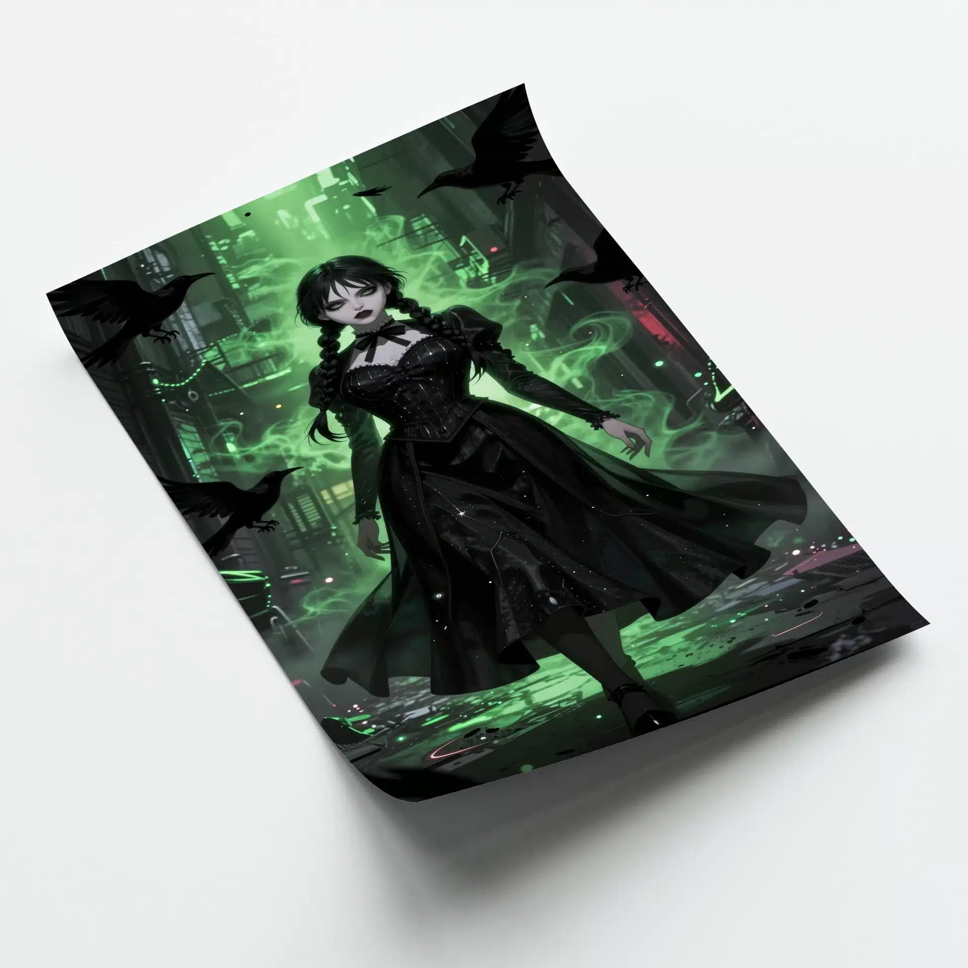 ونزدی با لباس سیاه نمادین خود در مرکز تصویر قرار دارد، در حالی که مه سبز روشن پشت سرش میدرخشد و سایههای قرمز اطرافش را روشن میکند. کلاغهای سیاه و اثرات ذرهای مرموز، فضایی سینمایی و پرجزئیات خلق کردهاند.