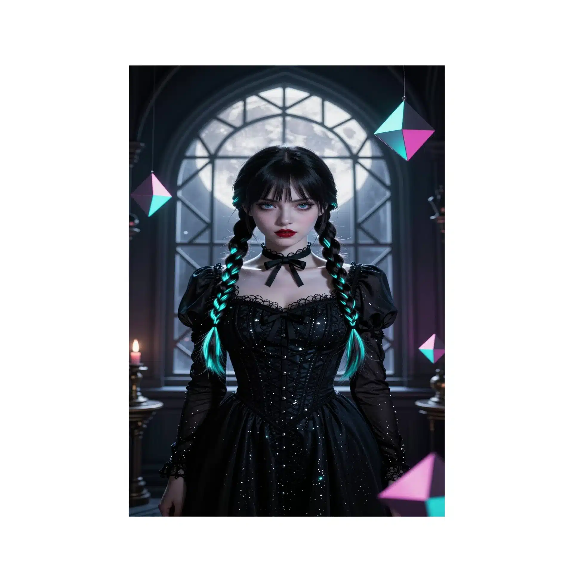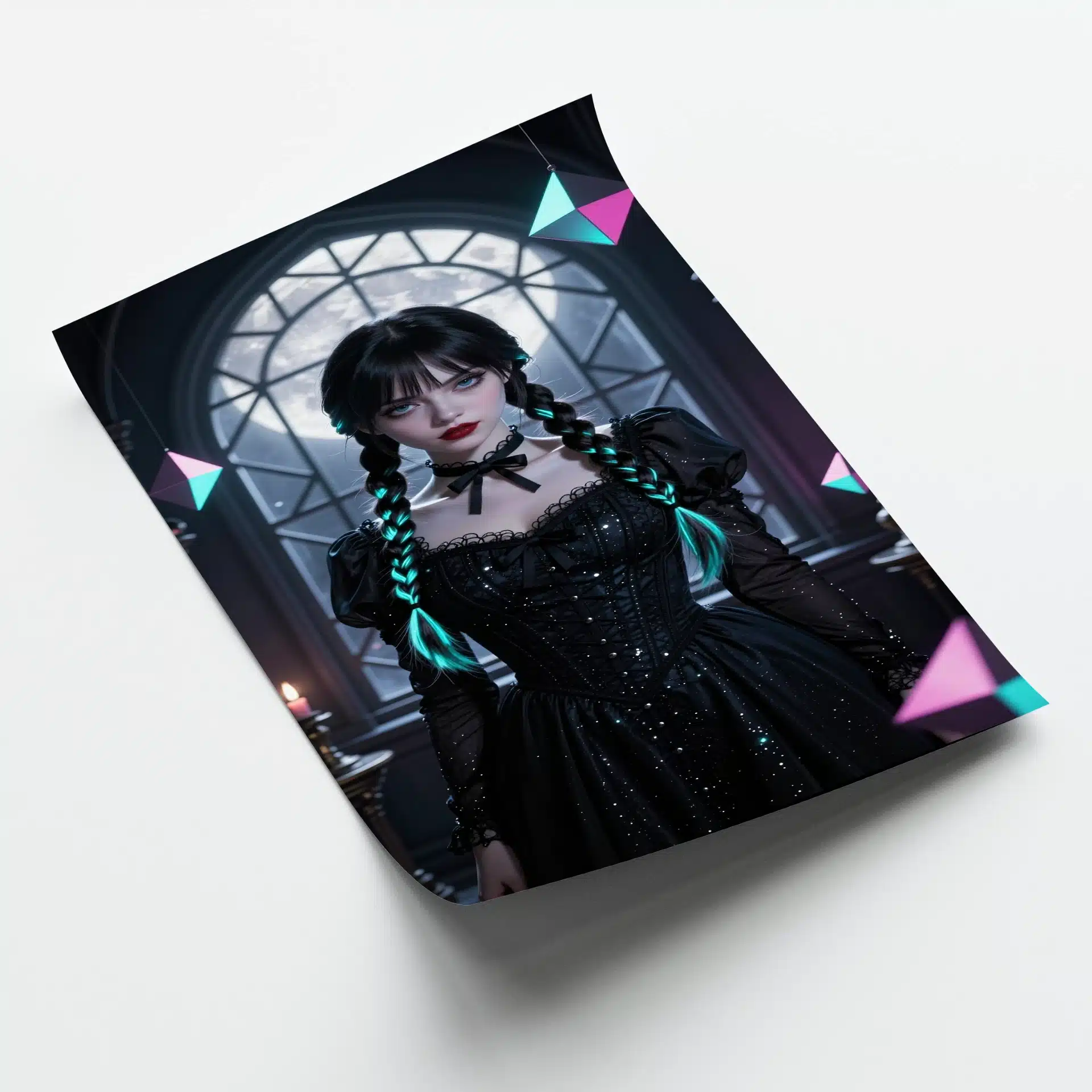 پوستر ‘ونزدی’ تصویری خیرهکننده از ونسدی آدامز را در فضایی گوتیک و دنج به نمایش میگذارد. با نور مهتابی نقرهای و هایلایتهای سیان نئونی در موهای بافتهاش، این اثر ترکیبی از هایپررئالیسم و سبک انیمه است.