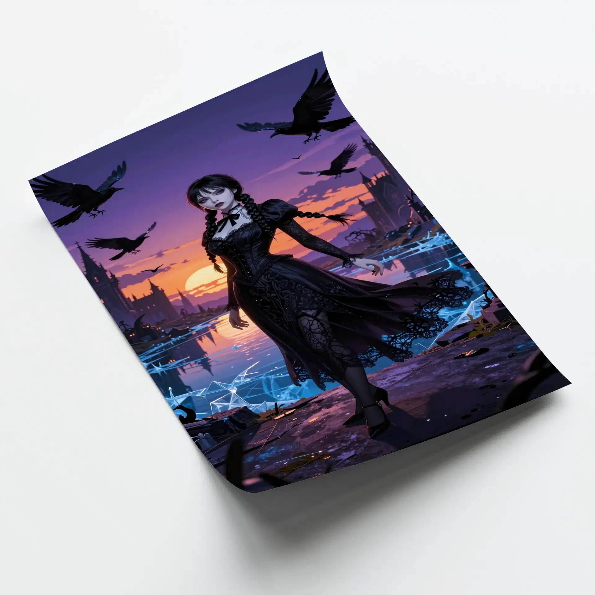 پوستر ‘ونزدي’ با الهام از شخصیت ونسدی آدامز طراحی شده است. این اثر هنری در یک منظره گوتیک و در زمان غروب آفتاب، با نورپردازی چشمگیر و رنگهای بنفش و نارنجی خیرهکننده، حال و هوایی تاریک و فانتزی را به تصویر میکشد.