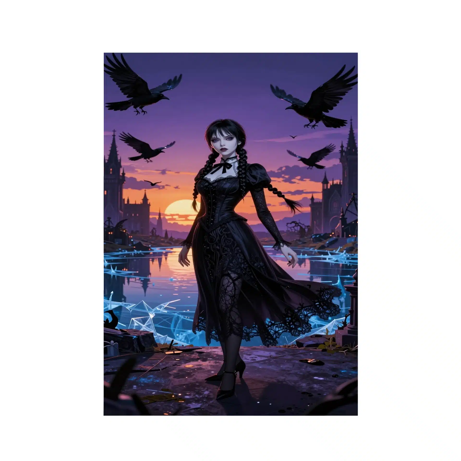 طراحی این پوستر با جزئیات بالا و سبک انیمه انجام شده است. استفاده از پرسپکتیو فیشآی و انعکاسهای آبی رنگ در دریاچه، همراه با پرندگان کلاغ که در اطراف ونسدی در حال پرواز هستند، جلوهای سینمایی و جذاب به اثر بخشیده است.
