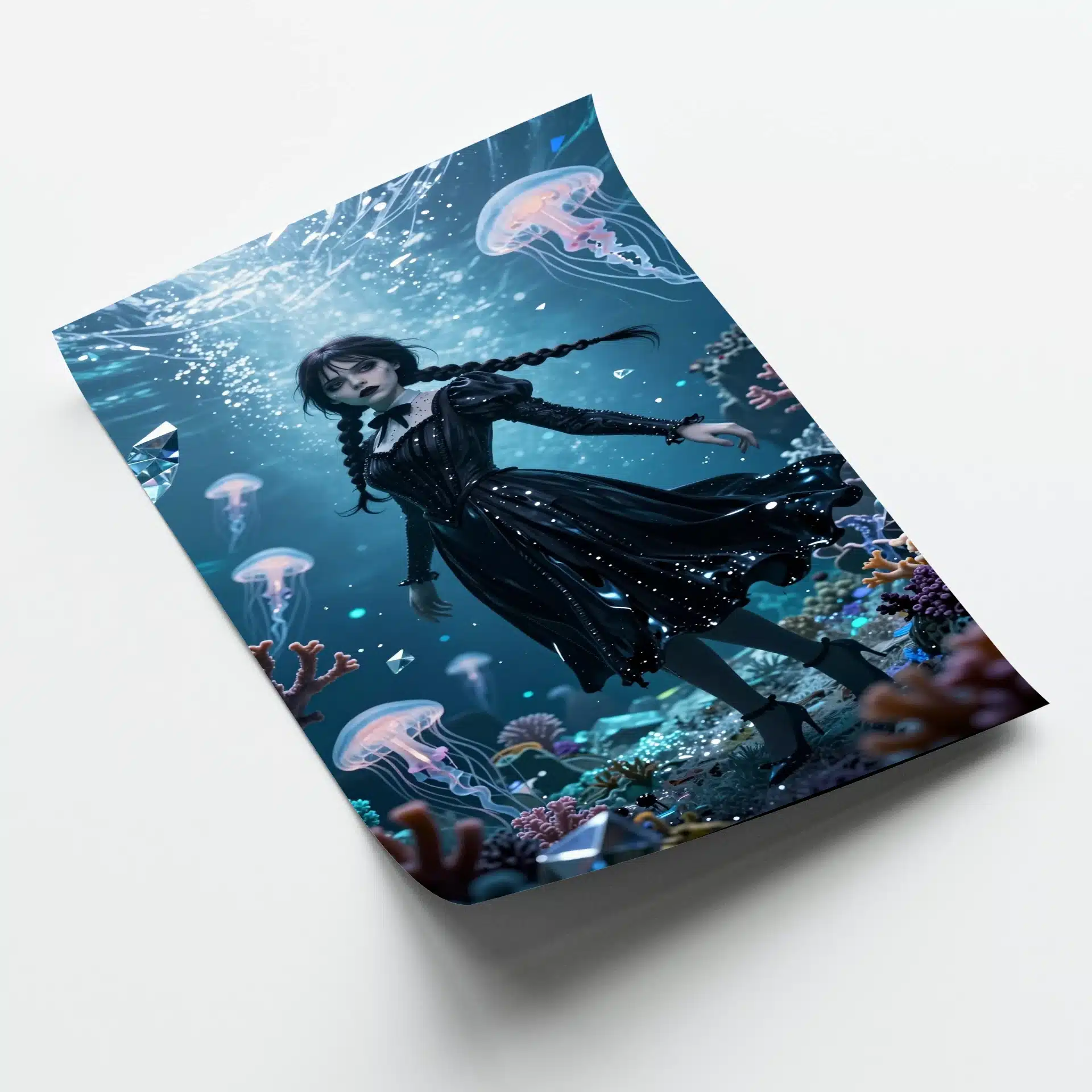 پوستر ‘ونزدی’ با الهام از شخصیت و محیطی رویایی و مرموز طراحی شده است. این اثر با سبک انیمهای و ترکیب رنگهای آبی فیروزهای و نقرهای، صحنهای زیرآبی و یخزده را به تصویر میکشد که در آن وونزدی آدامز بهصورت یک شخصیت مینیاتوری در میان مرجانهای درخشان و عروسهای دریایی شناور دیده میشود.
