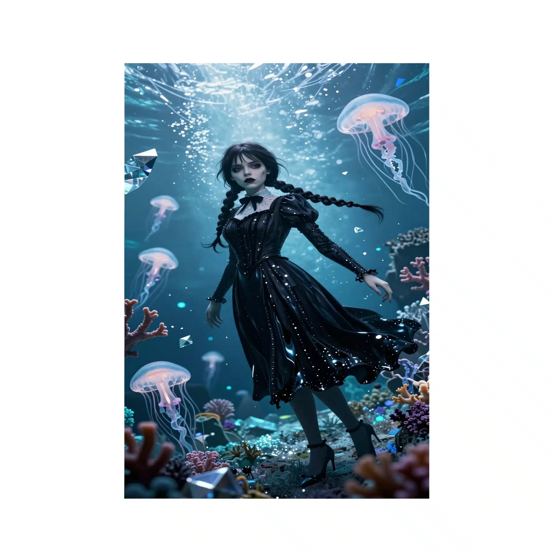 جزئیات طراحی شامل لباس سیاه روان مانند جوهر، موهای شناور اتری، و کریستالهای یخی هندسی است که نورهای پراشیده رنگارنگ را منعکس میکنند. نورپردازی فلورسنت آبی و سایههای متالیک، ترکیبی جذاب از زیبایی گوتیک و دنیای فرازمینی خلق کرده.